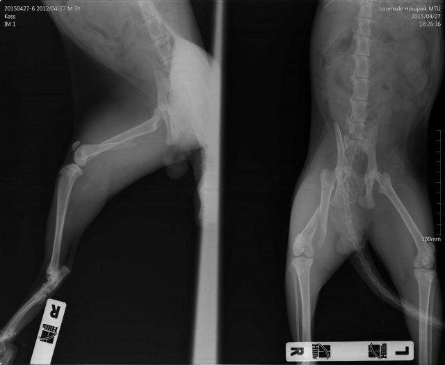 Kass kukkunud ilmselt aknast alla, tagumise käpa luumurd.