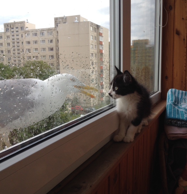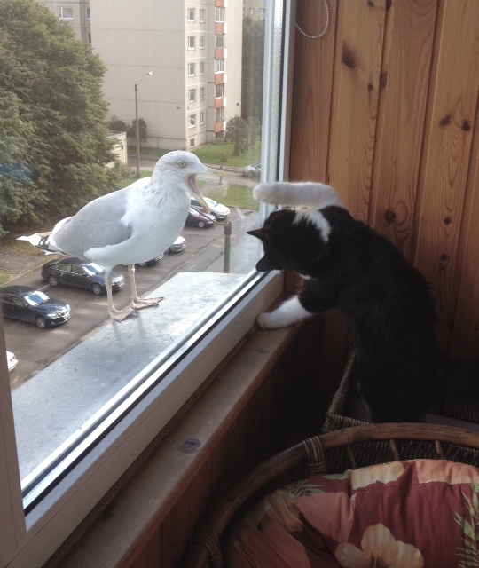 какой храбрый малыш, такого огромного и наглого птица не испугался! как же хорошо котику живеться в любви и заботе!