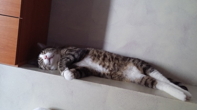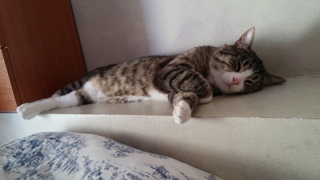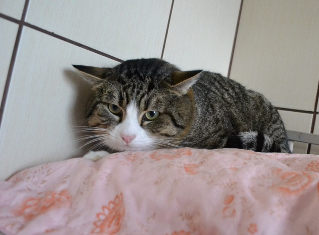 Этот котик Natsu (по-японски означает Лето) живёт у моей подруги. Немного переживает, но кушает хорошо и в туалет ходит в правильное место. Ночью хотел залесть в хозяйскую кровать, но его там не ждали.