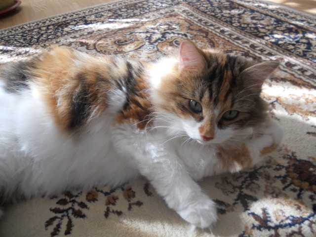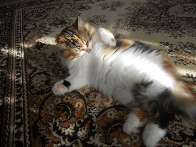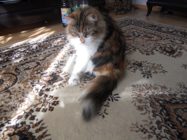 София, по немногу начинает привыкать к новому дому. Проявляет интерес ко всему, видимо для неё многие вещи и звуки в диковинку))), уж очень реагирует на них бурно.Но не смотря на всё это, обход по квартире проводит ночью, и в игрушки играет ночью.Уже спокойно даёт себя по чесать расчёской, и спокойно себя ведёт когда беру её на руки,правда пока не надолго. У неё шерстка стала мягенькой и блестящей. Одним словом красавица.