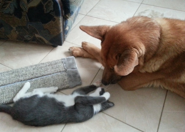 А еще я подружилась с собакой, которая здесь уже жила! Сначала, конечно, было страшно. Но теперь нам вдвоем очень весело! Ему я тоже помогаю. Если он чем-то занят, я ложусь на его коврик у двери и охраняю дом. Я даже порой думаю, что может я тоже собака? Только на прогулки меня почему-то не берут.
