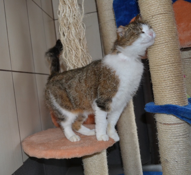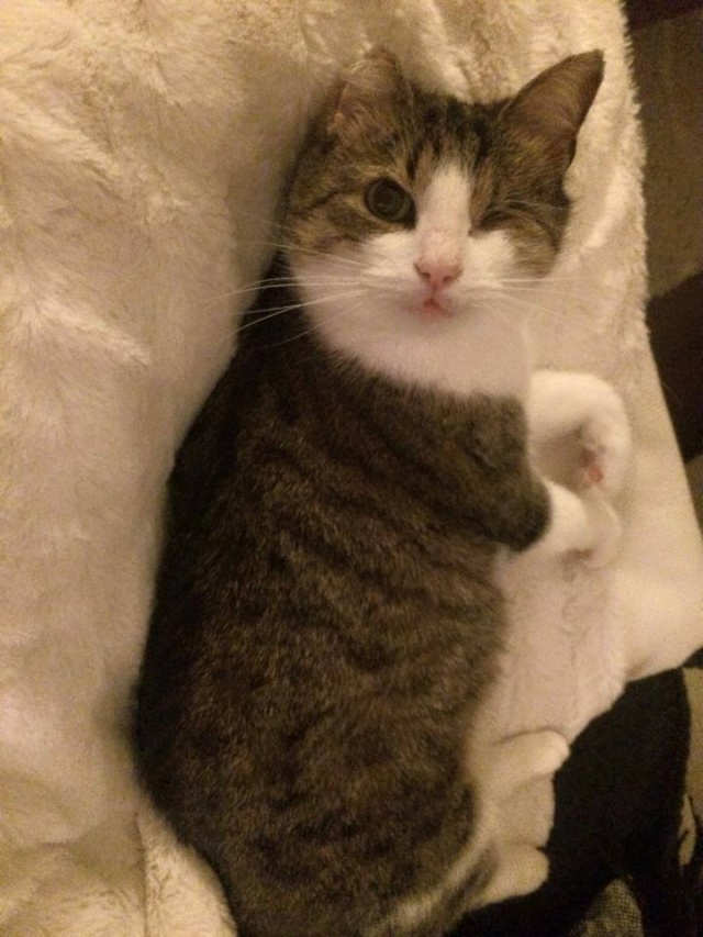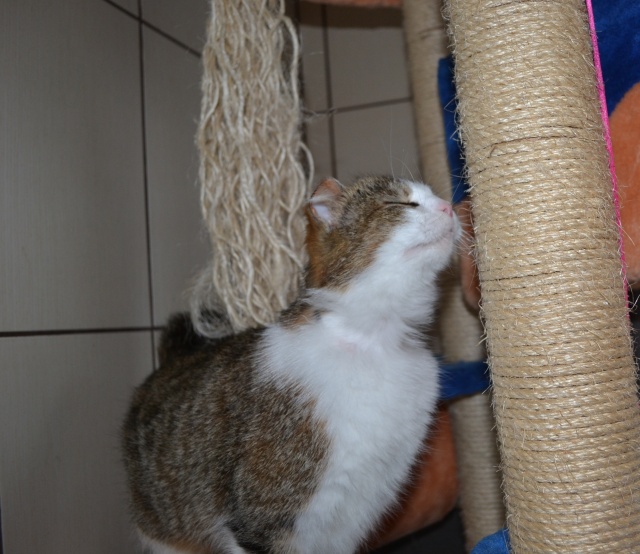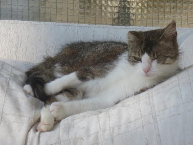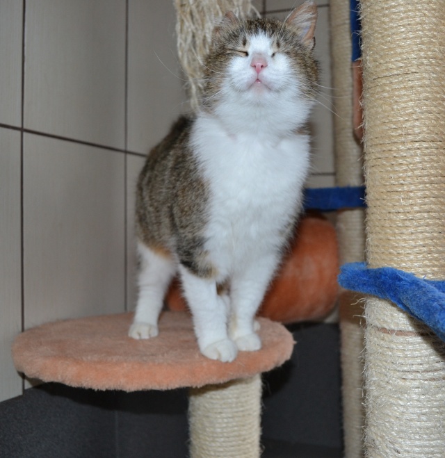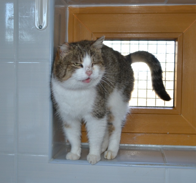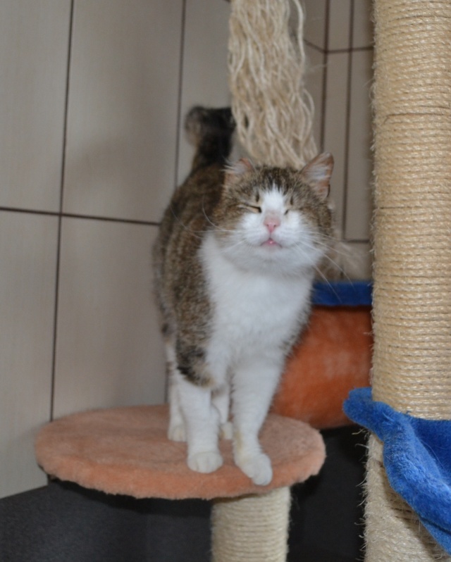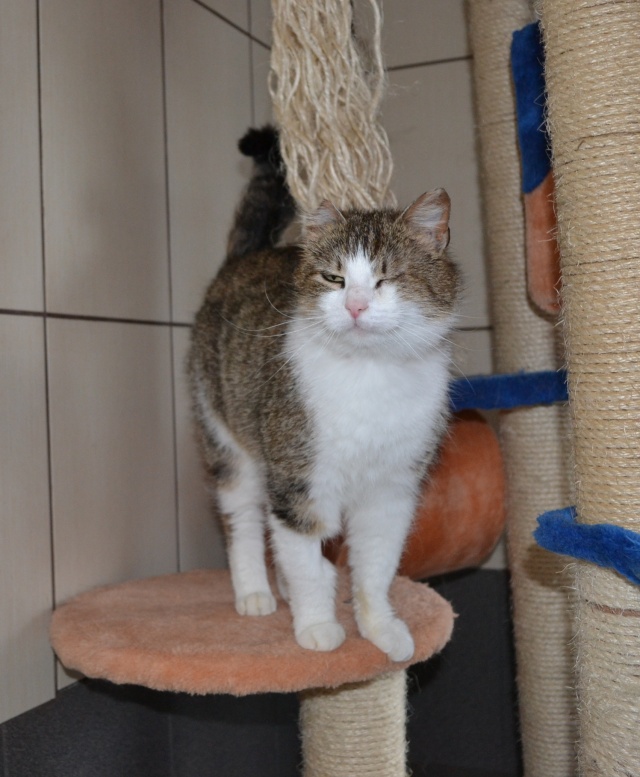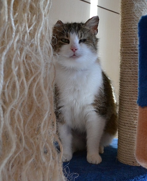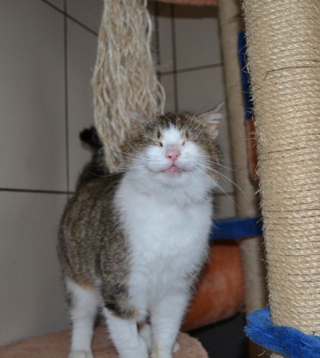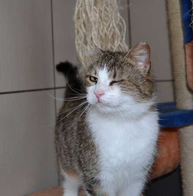 Parema kõrva ja vasaku silma vigastusega. Veidi uje, aga sõbraliku loomuga kassike, kui usaldus võidetud saab. Ta ei tule ise suhtlust otsima ja talle ei meeldi väga süllevõtmine, aga kui ta üles leida ja talle tähelepanu pöörata, siis silitamist tahab ta väga. Kui inimene on saanud talle tuttavaks ja talle meeldib, siis teatab ta oma asukohast juba tuppa sisenemisel.