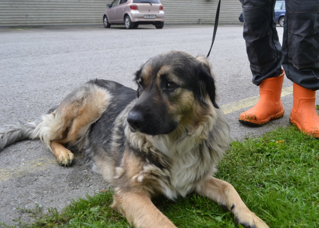 Koeral kiip, registris andmed ebatäpsed. Väljakutse järgi oli koer tee ääres ja tema juures kilekott, justkui oleks maha jäetud.