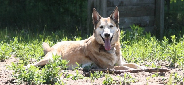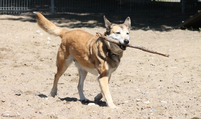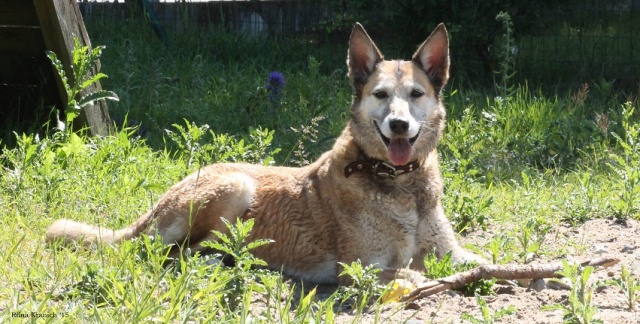 Хорошая спокойная девочка. Любит таскать из воды камни и подбирать ветки. С прогулки пыталась принести в приют можно сказать целое бревно, но потом устала его тащить и передумала :)