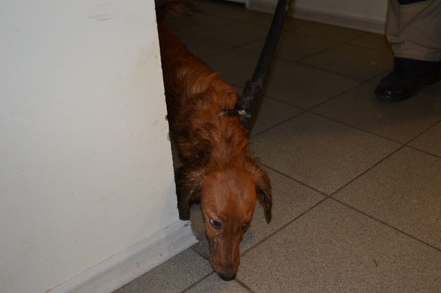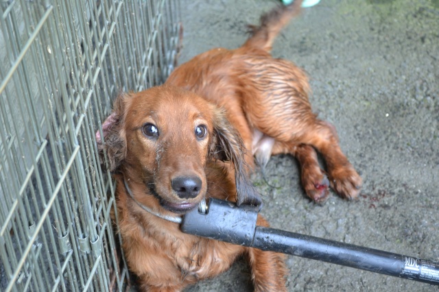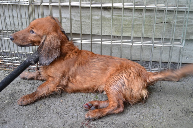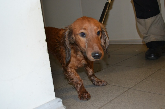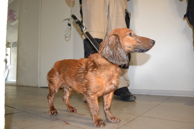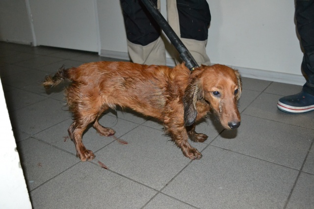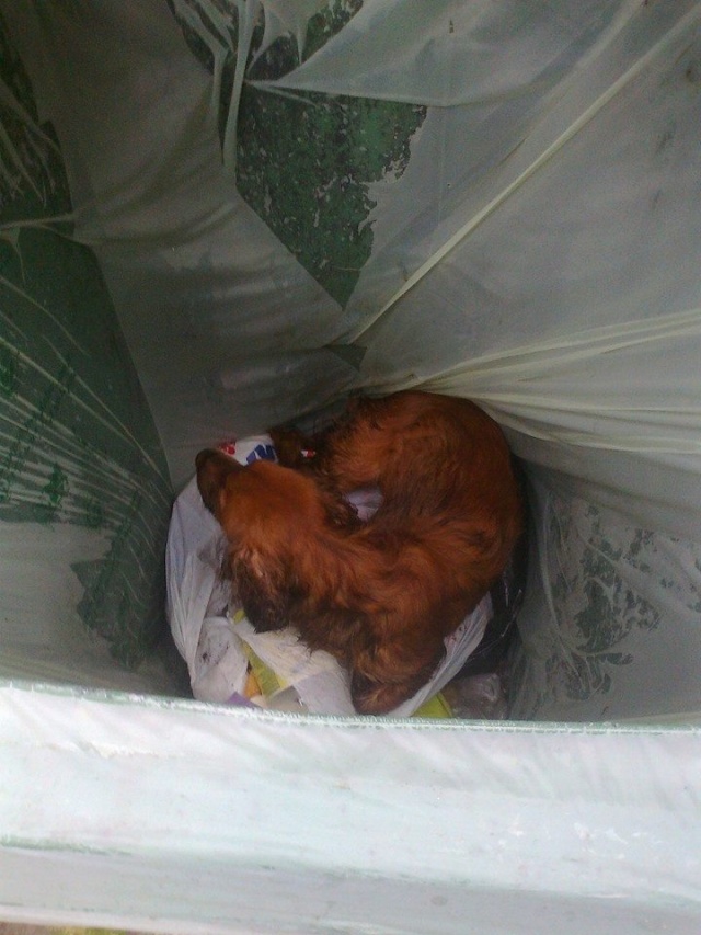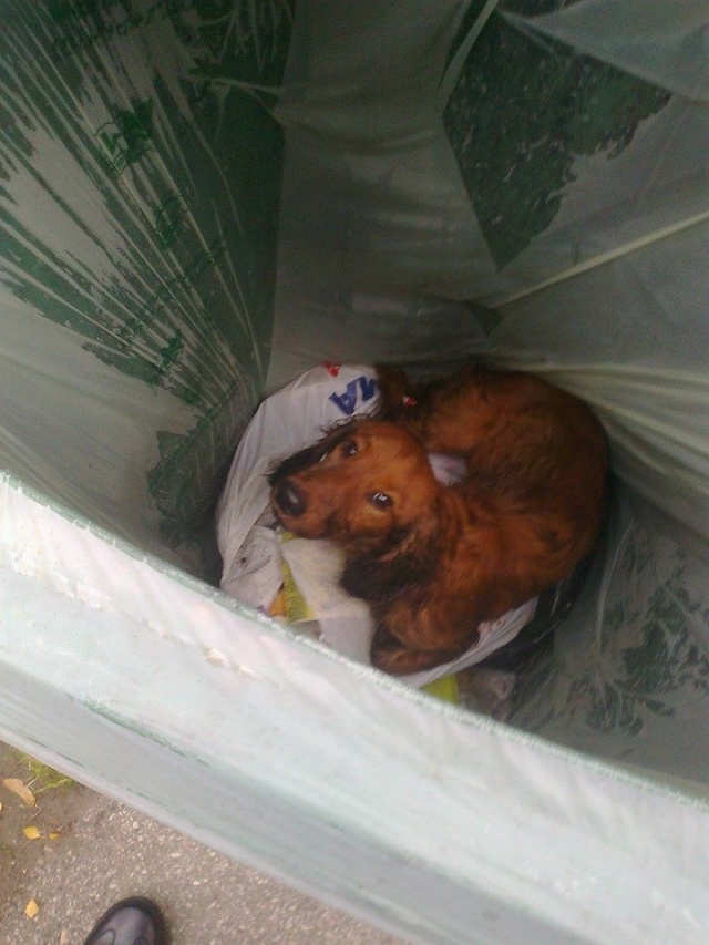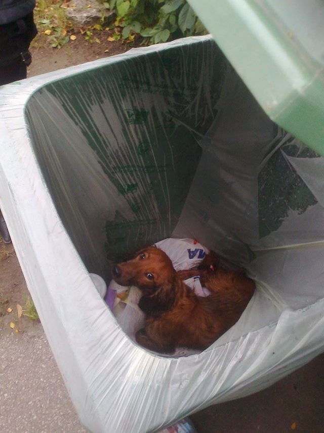 Koer oli visatud biojäätmete prügikonteinerisse. Sealt ta ka hommikul leiti toreda inimese poolt, kes läks prügi välja viima. Koer on märg, hirmunud, haiseb ja naljane.
