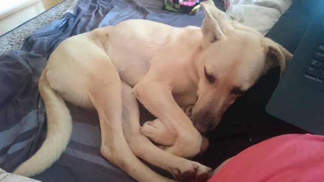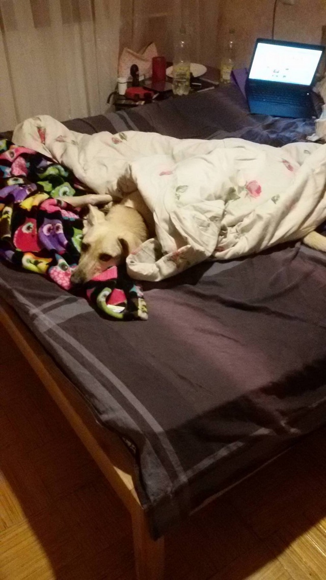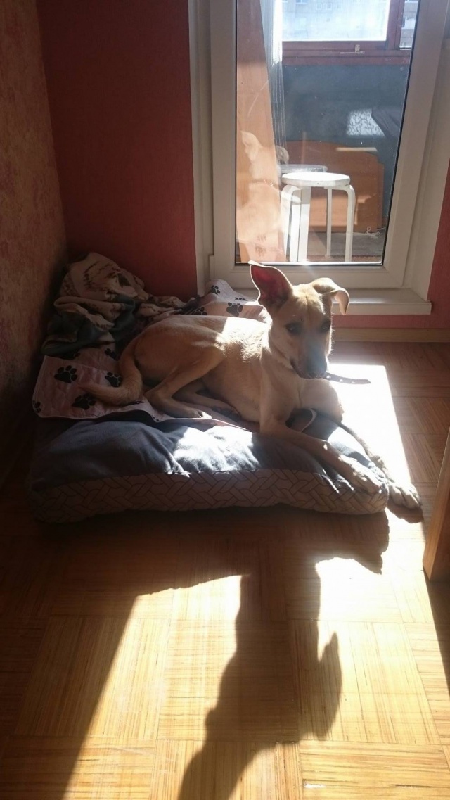 Ta on väga suure söömaga ning mis mulle tuli üllatusena, ta millegi pärast pelgab väikesemaid koeri. Meie naabruses on väga palju teisi koeri ning kui jalutama minna ja mõni eriti pisike tuleb vastu, hakkab Naida end kohe koju kiskuma. Lisaks on tal ka suur hirm lifti ees, nii et päevas vähemalt kolm korda saame me trenni teha ning jala kuuendale ronida. Täna tegime esimese vannitamise ka ära, mis läks küllaltki edukalt. Üldiselt on tunne ja loodan, et Naida on oma uue koduga rahul ning õnnelik. Lisan ka mõned pildid meie esimesest nädalast.
