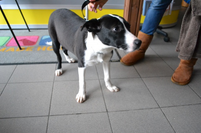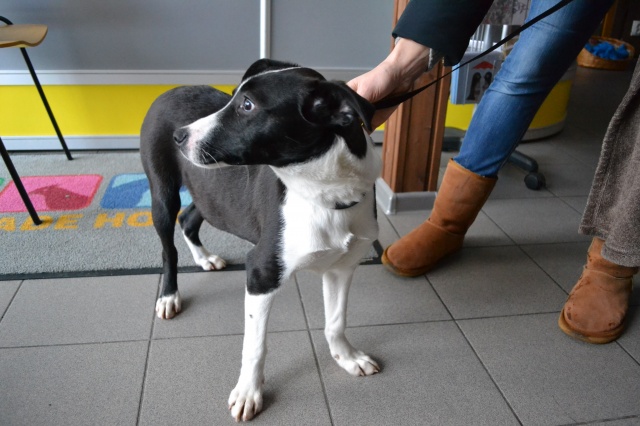 Напишу на русском тоже. Общались с этой собачкой. Очень общительная, открытая и радостная девочка. Не боится. За время общения с ней не проявляла ник апли агрессии в отношении других собак, людей и детей. Сама, как любопытный и веселый ребёнок. Очень хочет внимания, играть. Очень красивая внешность, на голове белая полосочка. Обратите внимание на эту красавицу, и приходите с ней знакомиться. Очень-бы подошла в семью, где тоже живут активные, позитивные и веселын люди и дети :)