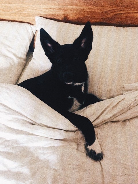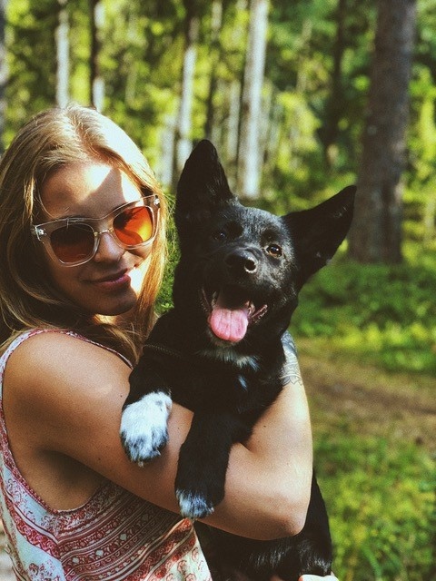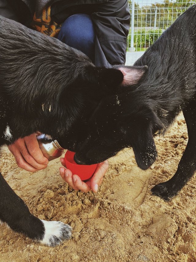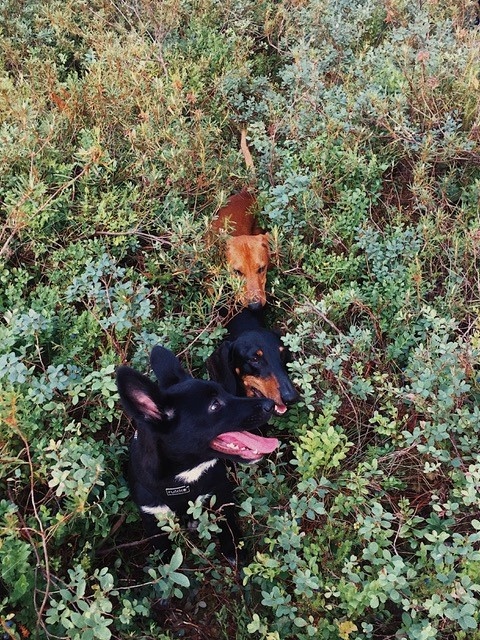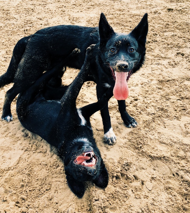"Toby ja vend Tõru said esimest korda kokku peale varjupaika :). Klapp oli silmapilkne ja oleksid võinud kasvõi õhtuni mängida. Mõlemal ka samad karjatamisharjumused ja magavad kodus voodi all, isegi siis kui enam sinna ei mahu väga hästi :D"