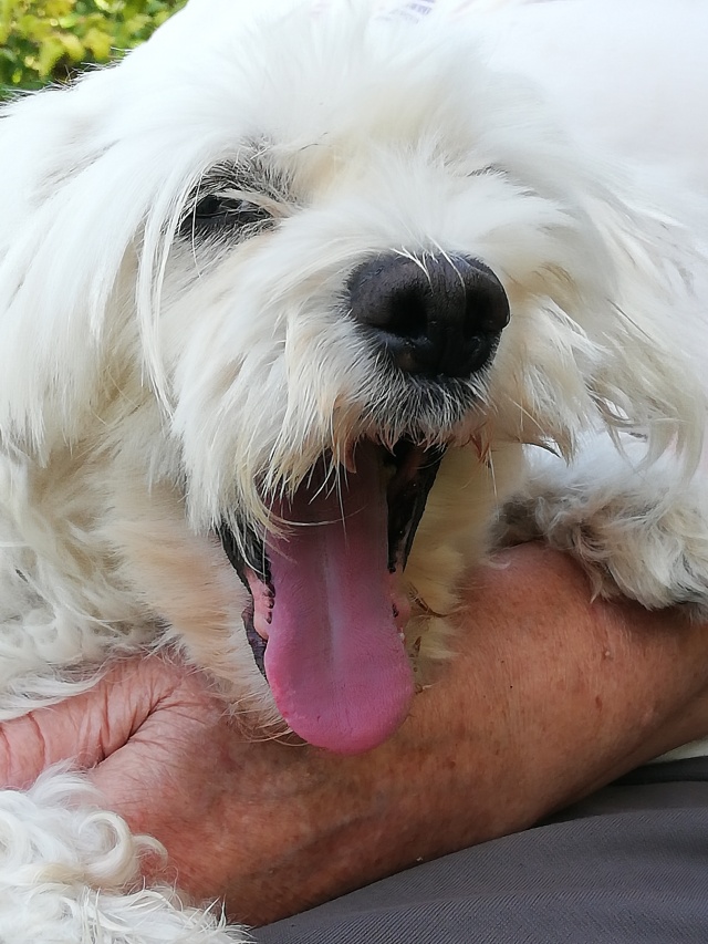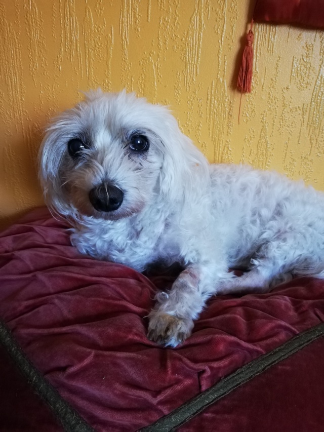 Tige väike bolonkalaadne koerake muutus kohe rõõmsaks, kui pääses autosse, millega ta koju viidi. Uues elukohas jooksis ta rõõmsalt mitu tiiru aias ringi ning lasi peale seda kannatlikult oma silmi puhastada.. Nimeks sai ta Krissu.