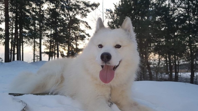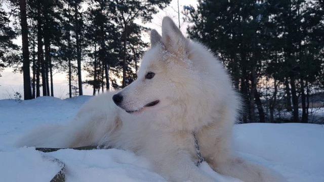 Как самоедские лайки здорово выглядят на снегу! И как ему на снегу комфортно!
