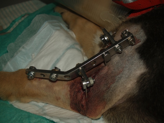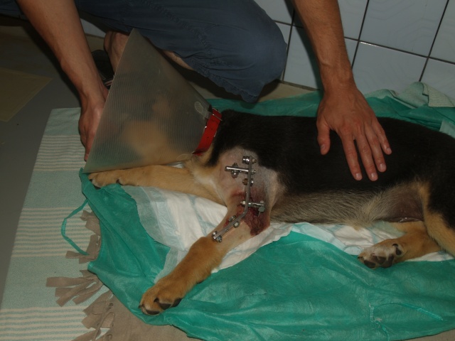 При поступлении в приют сразу отвезли на рентген. Выяснилось, что у собаки перелом передней лапы. Сразу же в этот день сделали операцию (21 июля, 2011). Сейчас состояние собаки нормальное.
