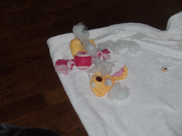 Kuid kui pikalt üksi koju jääb, siis ikka maradööritseb nii, et vähe pole. Lõhutuid ja närituid asju on küllaga. Mänguasjad mis talle on ostetud peidab vaid kuskile diivani vahele. Aga noh, mis teha – noorte koerte värk, loodame, et kasvab ikka välja sellest…
