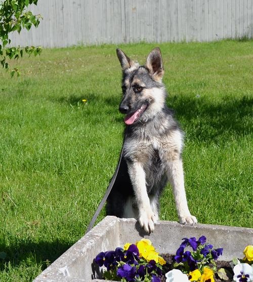 Praegu on ta pigem arg ka inimeste suhtes. Tuli koos pildil oleva teise kutsikaga, nii et päris agressiivne ta teiste loomade suhtes ei ole (on ju ka pildil sõbralikult koos). Kuna ta veel inimestega ka vähe suhtleb, ei ole me teda teiste koerte, kasside ega lastega testinud.