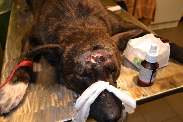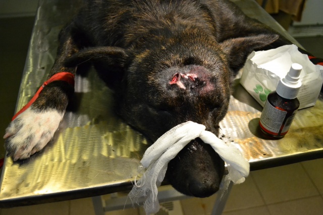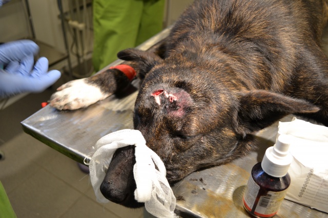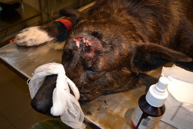 Собака получила удар по голове тяжёлым острым предметом. Прикушена щека, из носа течёт кровь, кровоизлияние в глаз и перелом лобной кости (трещина глубиной са 1 см). Собака добрая и весёлая. Очень жаль, что люди так жестоки... Необходимая помощь и лечение собаке оказывается!